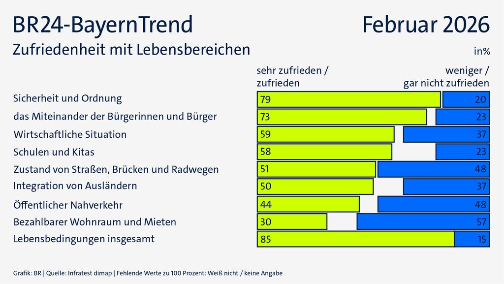 Die Bayern sind mit ihren Lebensbedingungen insgesamt sehr zufrieden. Anders, wenn sie auf Teilbereiche schauen – da schwankt die Zufriedenheit. Unterschiede gibt es auch nach Parteipräferenz und Wohnort. Das zeigen die Ergebnisse des BR24 BayernTrends zur Kommunalwahl am 8. März.