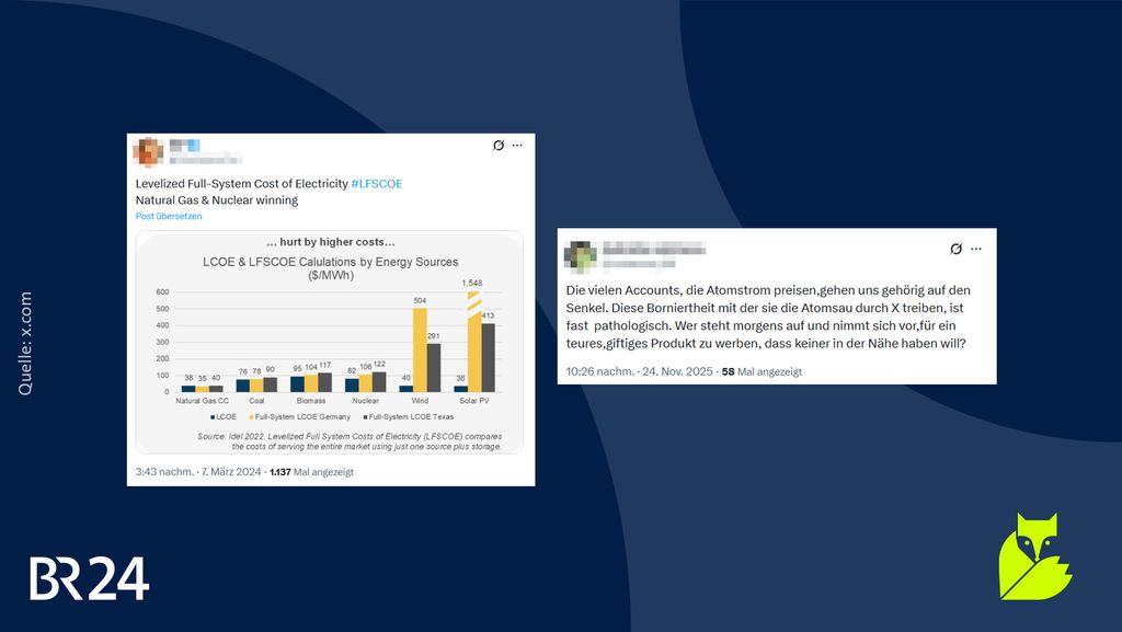 Häufig geht es in den Diskussionen um den Preis von in AKW erzeugtem Strom. Die AfD bezeichnet Kernkraft zum Beispiel als "preiswerte" Energieversorgung. Die Heinrich-Böll-Stiftung, die parteinahe Stiftung der Grünen, schreibt dagegen "Atomstrom ist teuer". Und auch die Bürgerinnen und Bürger diskutieren über die Kostenfrage. Atomstrom sei ein "teures Produkt", schreibt ein User auf X. Ein anderer behauptet, Kernkraft gewinne den Kostenvergleich gegen andere Formen der Stromerzeugung