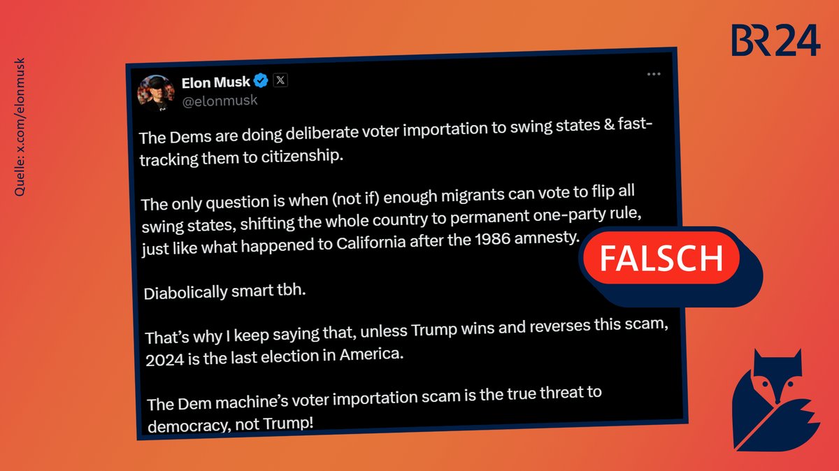 Anfang Oktober verbreitete Musk auf X beispielsweise die falsche Behauptung, dass die Demokraten gezielt illegale Immigranten in "Swing States" holten. Diese Immigranten sollten angeblich beschleunigt eingebürgert werden, damit sie demokratisch wählen und damit langfristig deren Mehrheit zementieren. "Swing States" sind die Staaten, in denen das Rennen zwischen den Demokraten und den Republikanern um eine Mehrheit der Stimmen besonders knapp ist. Wie Politifact schreibt, kann es zehn Jahre oder länger dauern, bis Immigranten in den Vereinigten Staaten US-Staatsbürger werden können. Das ist die Voraussetzung dafür, um bei US-Präsidentschaftswahlen wählen zu dürfen. Dazu komme: Es ist kein Automatismus, dass diese Menschen dann für die Demokraten stimmen.